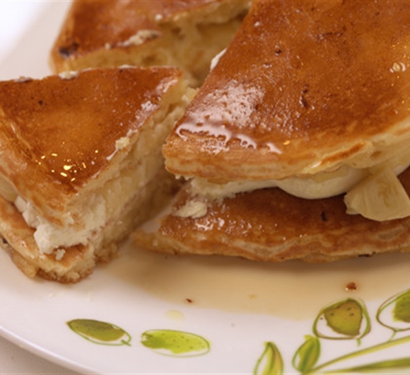 ②在其中加入新鲜的榴莲肉,两面煎至金黄色后盛出,再淋上甜奶油和糖浆就完成了。