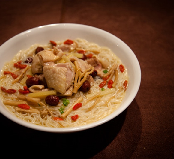 了让麻油鸡面线的滋补效果更好,需要将红枣和枸杞一同放入,最好再倒入少许台湾米酒,再继续炖煮高汤和鸡腿肉。