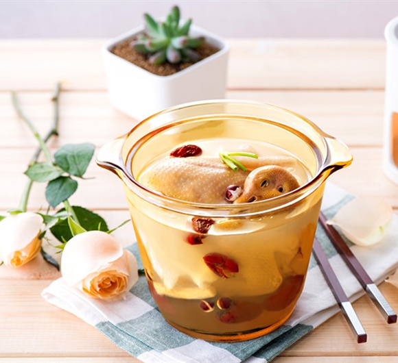 乳鸽300克、淮山、枸杞子、沙参、玉竹、芡实、红枣各10克