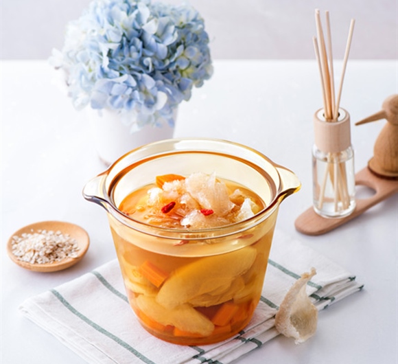 3.将处理好的燕窝、红枣、冰糖放入Visions1.2L炖盅内,加清水至炖盅锅身2/3处,将炖盅置于电陶炉上,用高档位火力煮沸后转为低档位火力慢炖1.5小时。加热期间,可通过透明玻璃陶瓷锅身,观察煮粥过程。