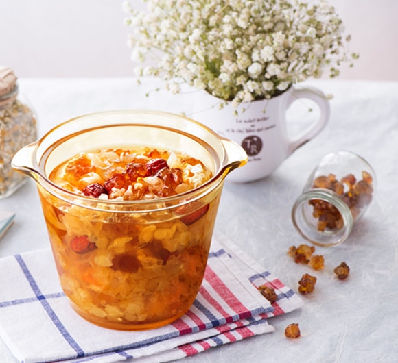 3.将桃胶、皂角米、银耳、红枣放入Visions1.2L炖盅内,加入清水至炖盅锅身2/3处,将炖盅至于电陶炉上,用高档位煮开后转为低档位慢炖3小时左右,直至粘稠。