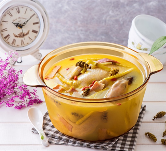 3.Visions5.5L汤锅内烧开水,依次放入整只鸭子、火腿、扁尖、枸杞子、姜片、葱结,倒入适量料酒,总量不超过锅身的2/3,小火炖煮2-3小时。起锅前,调入盐即可。