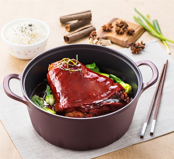 4.捞出葱结、姜片和香料包,盛出一半汤汁,加入生抽、老抽后大火收汁,用勺子将汤汁淋在猪肘的表面并不时翻动使之上色。待汤汁变浓稠时,将猪肘捞出装盘。锅内汤汁则熬至起泡后再淋在猪肘上