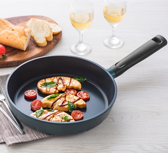 2.平煎锅内倒入少许橄榄油,放入鹅肝片,撒上百里香、罗勒叶,倒入少许甜酒煎至两面金黄后取出摆盘。锅内留底油,放入樱桃番茄,微煎至表皮起皱后搭配鹅肝片。