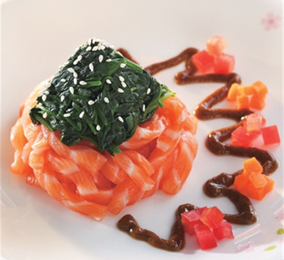 4 挤在三文鱼垫底的菠菜堆旁,撒熟芝麻和西红柿丁即可。