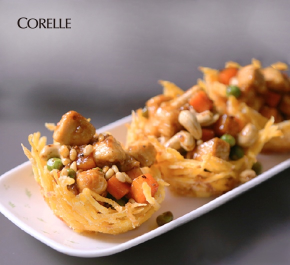 2. 将红薯丝炸软,压成杯子的形状,炸至酥脆完整取出;