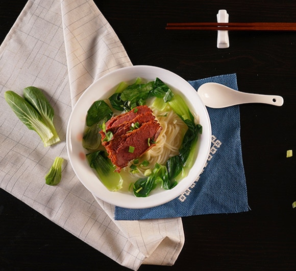 ⑤ 将备好的香葱、香菜和牛肉放于面条之上