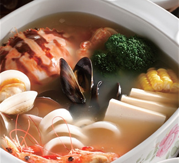 1 将食材洗净,在康宁锅中加入适量水,并放入螃蟹、鱿鱼卷、西兰花、玉米段等不太容易熟的食物。