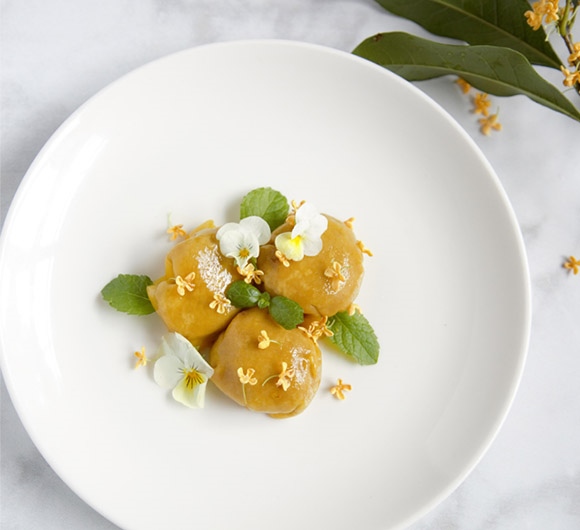 使用时候,小心拨开保鲜膜,把丸子摆上Corelle餐盘中心,撒点桂花糖和鲜桂花装饰。