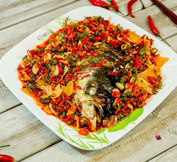 6. 煎锅中铺上腌制好的鱼头,铺上炒好后的剁椒。中火煮10-13分钟,出锅