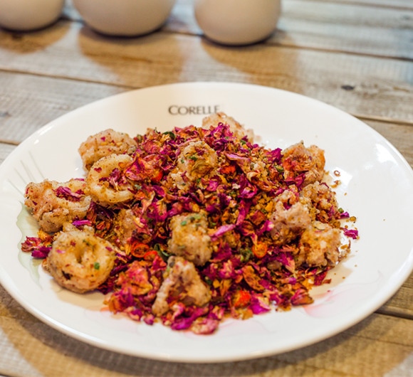 7、鱿鱼中卷放入调理盆中,再放入玫瑰花瓣、蒜酥、朝天椒圈、葱花、七味粉、胡椒盐翻炒五下,装盘