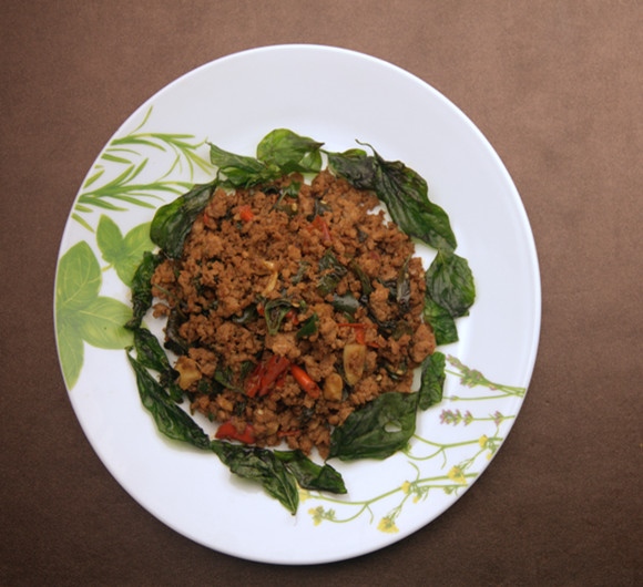 猪里脊、豇豆、青椒、红椒、大葱、大蒜、泰国辣椒、泰国辣酱、小洋葱、紫苏叶