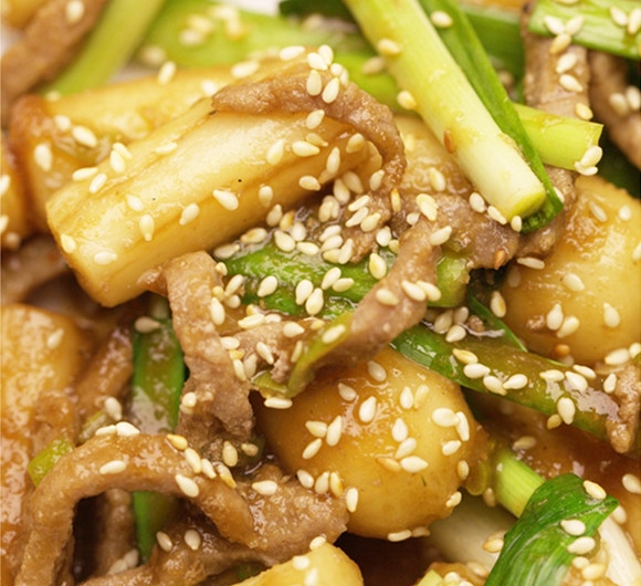 ④开始炒年糕,因为年糕本身就很黏,所以最好选用不粘锅。在锅中倒油,油热之后加入腌好的牛肉丝,翻炒变色后加入香菇片和洋葱丝翻炒,最后放入年糕继续翻炒片刻。宫廷菜以清淡为主,可以再加入一些蔬菜。将青椒、红椒去籽切丝,放入锅内一同翻炒。出锅前再用白砂糖和韭菜段调味,一道传统的宫廷炒年糕就作完成了。
