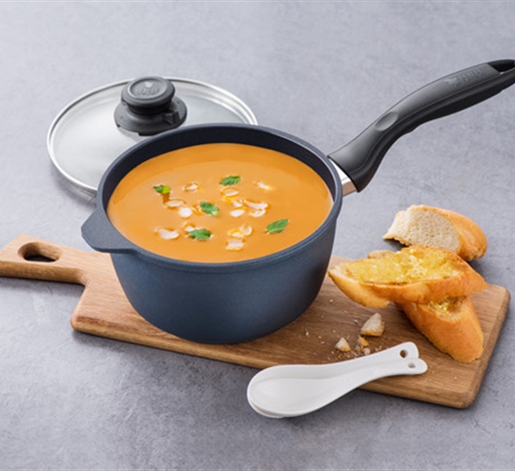 2. 南瓜去皮切小块,放入锅中,加入高汤煮30分钟,搅打成泥。