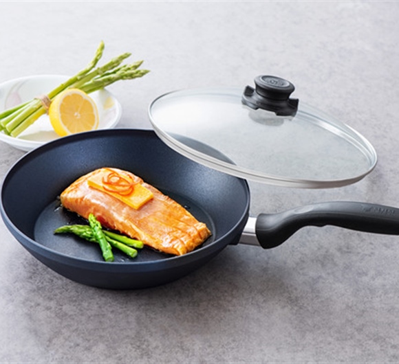 4.用锅中余油煎熟芦笋,放在装好盘的三文鱼旁即可。