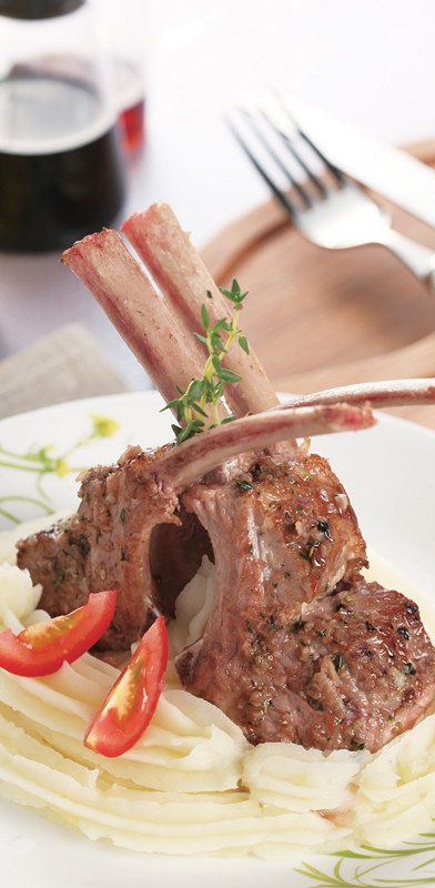 1 剔除羊排骨上的肥油后撒上盐、黑胡椒粉、百里香、大蒜碎腌渍。